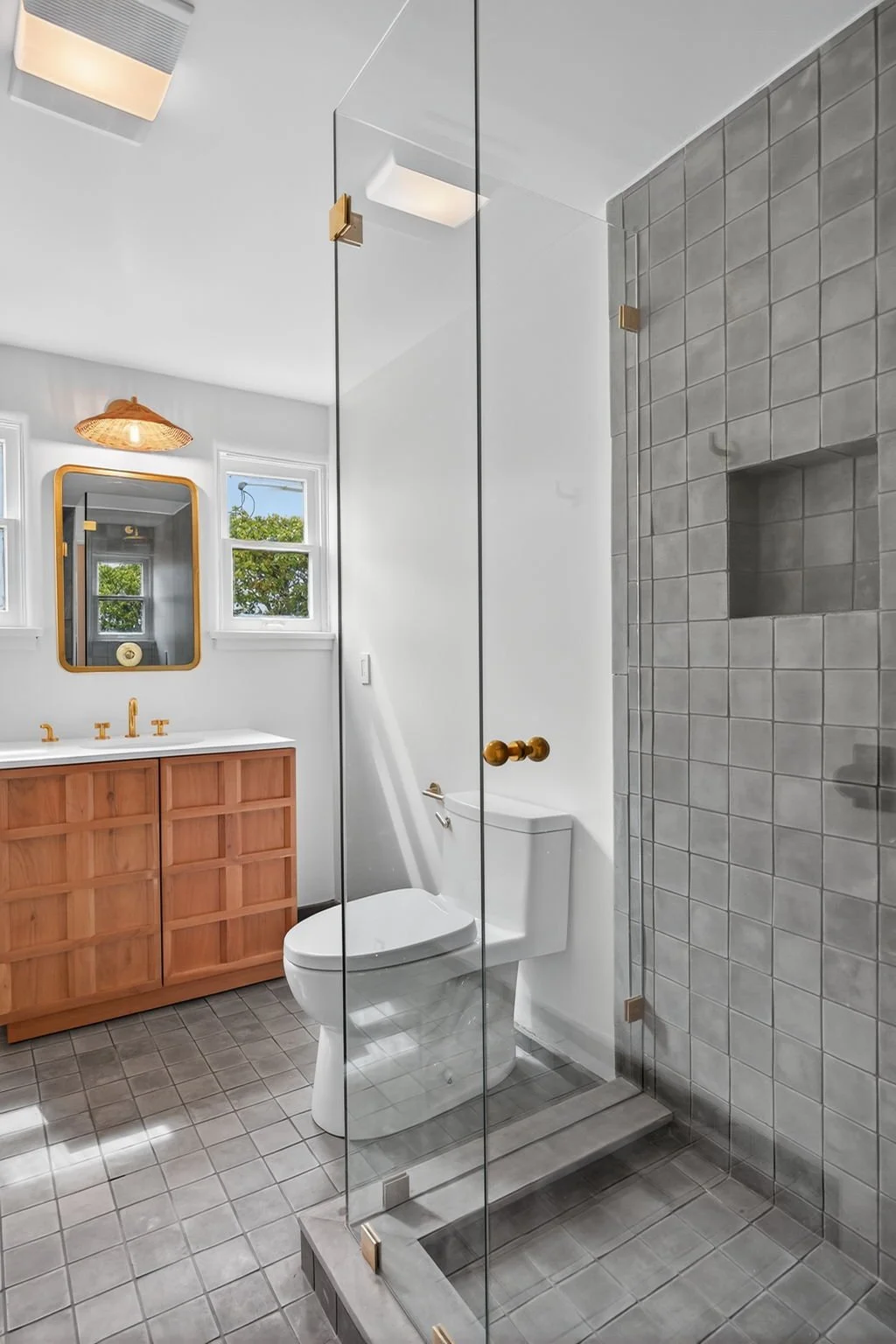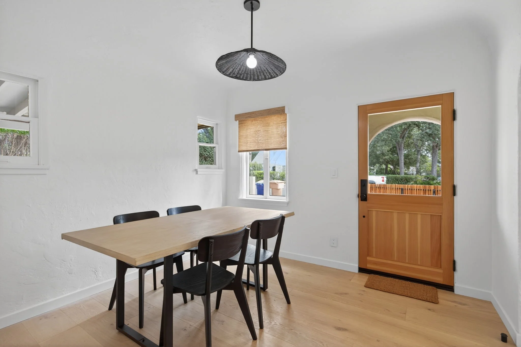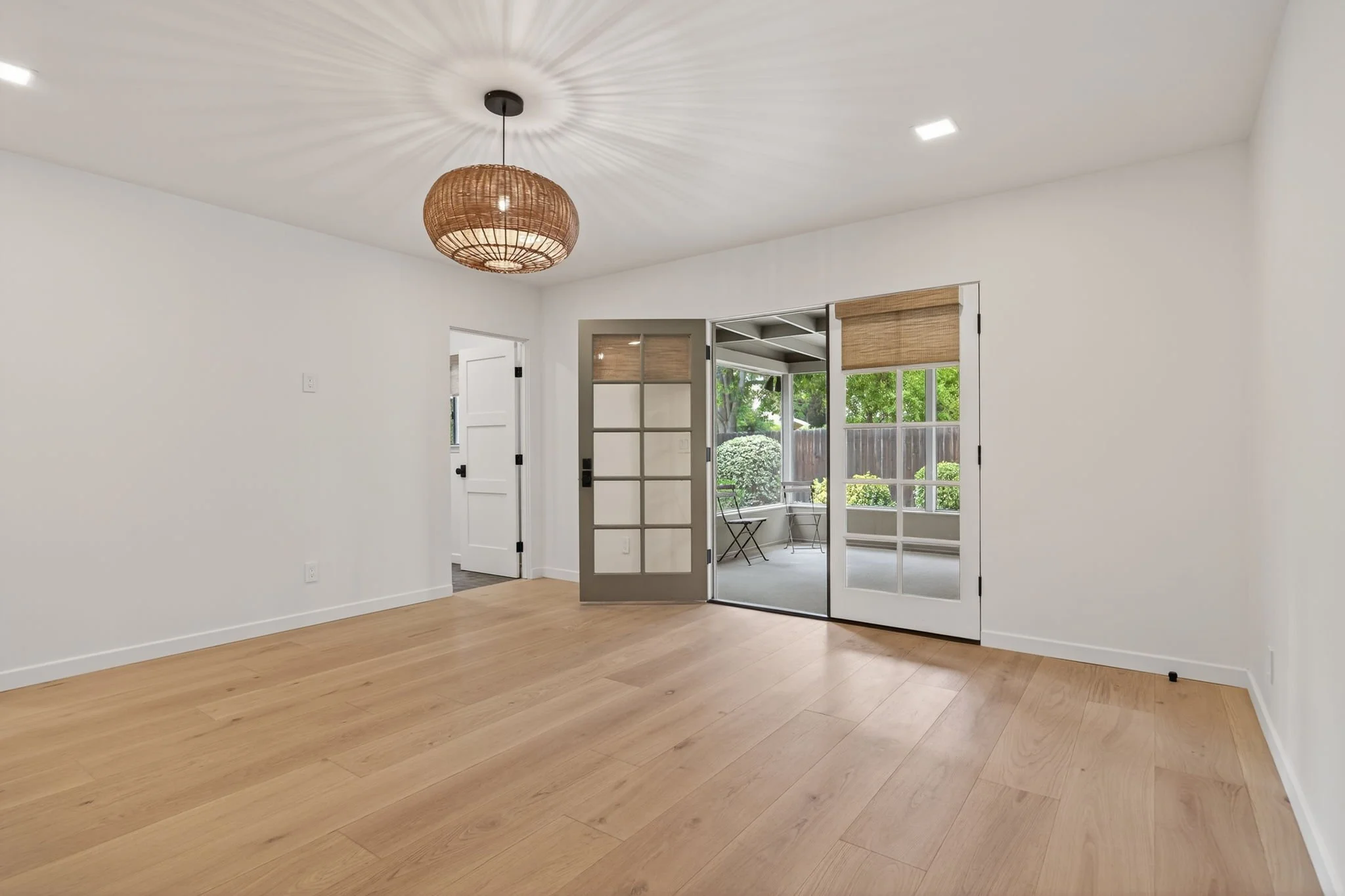 On one side of the home, you will find a bath, a guest bedroom, and a private primary suite with a large walk-in closet and a beautiful bath with a walk-in shower with custom tilework. French doors off the primary lead to an enclosed porch, perfect for outside dining or an artist studio. The other side of the house hosts a third bedroom, a full bathroom, and a spacious mudroom equipped with a washer and dryer. Three entry points to the backyard make the outdoors part of your lifestyle.