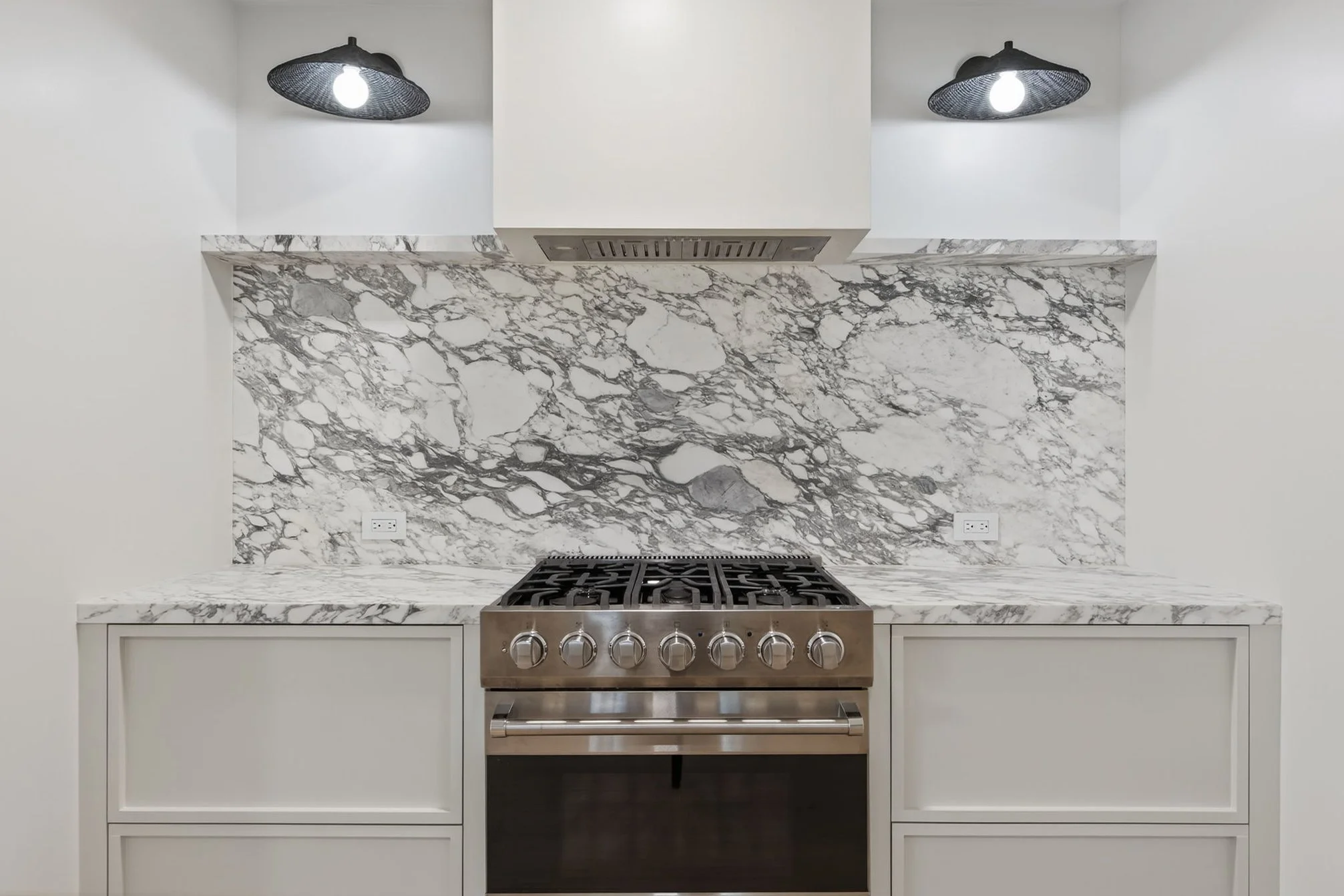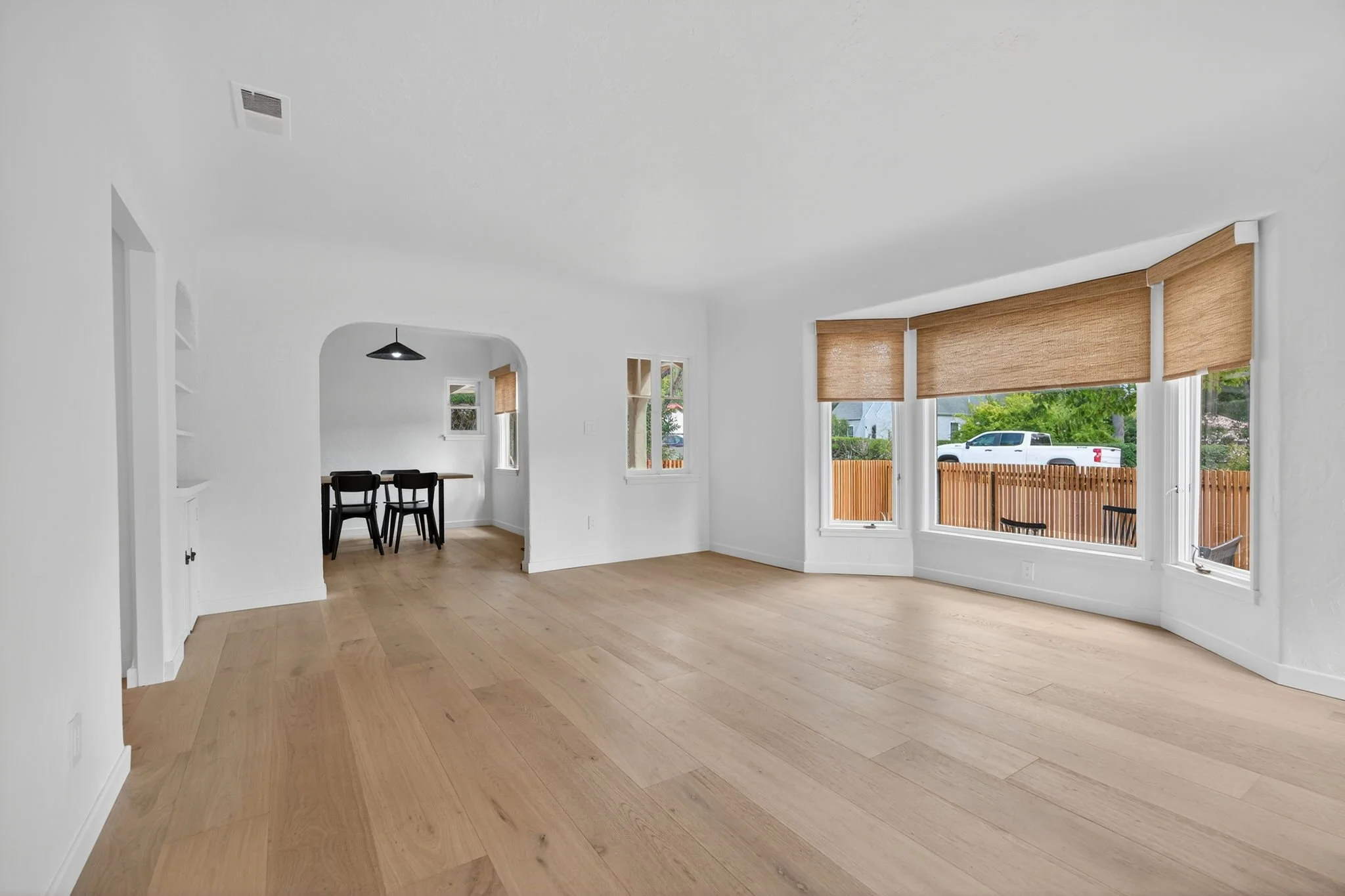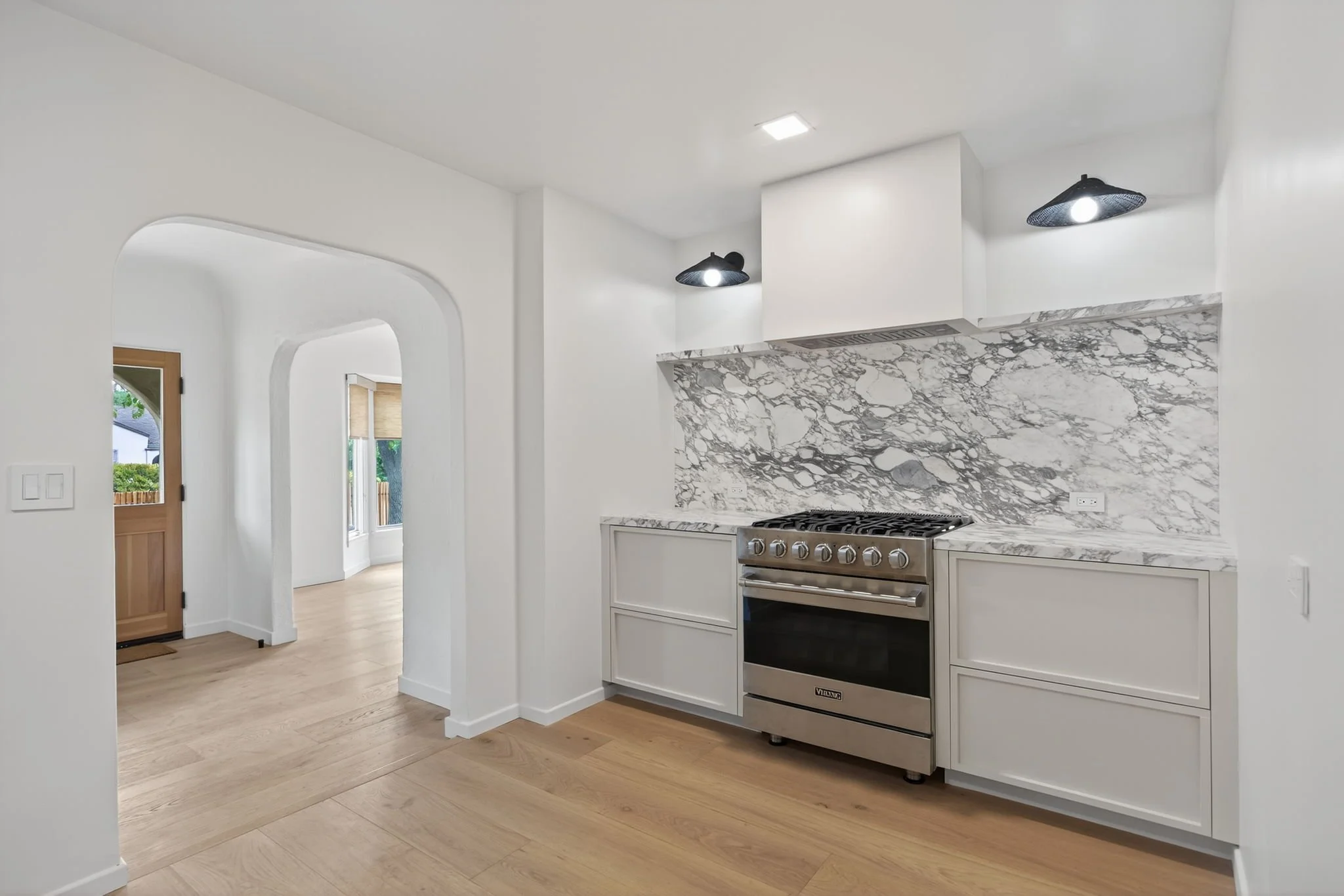 Enjoy a large living room with a fireplace, a breakfast nook, and a kitchen, all connected by arched entryways, built-ins, and white oak floors. The kitchen is a show stopper with custom Oak cabinetry, a seamless Calacutta sink and countertops, a Viking oven, and a Fisher-Pakel refrigerator tucked away within the cabinetry - because style and function should always live together.