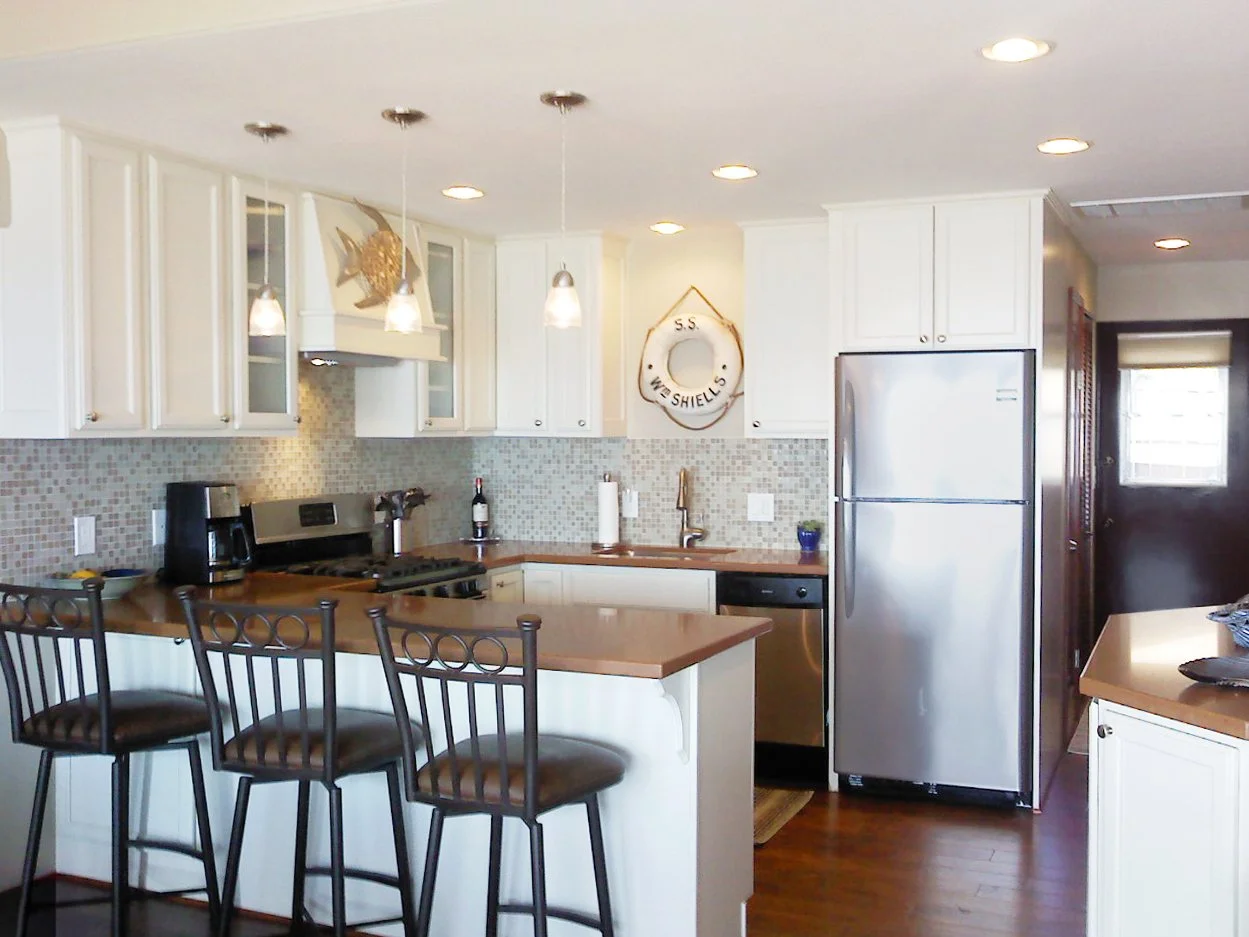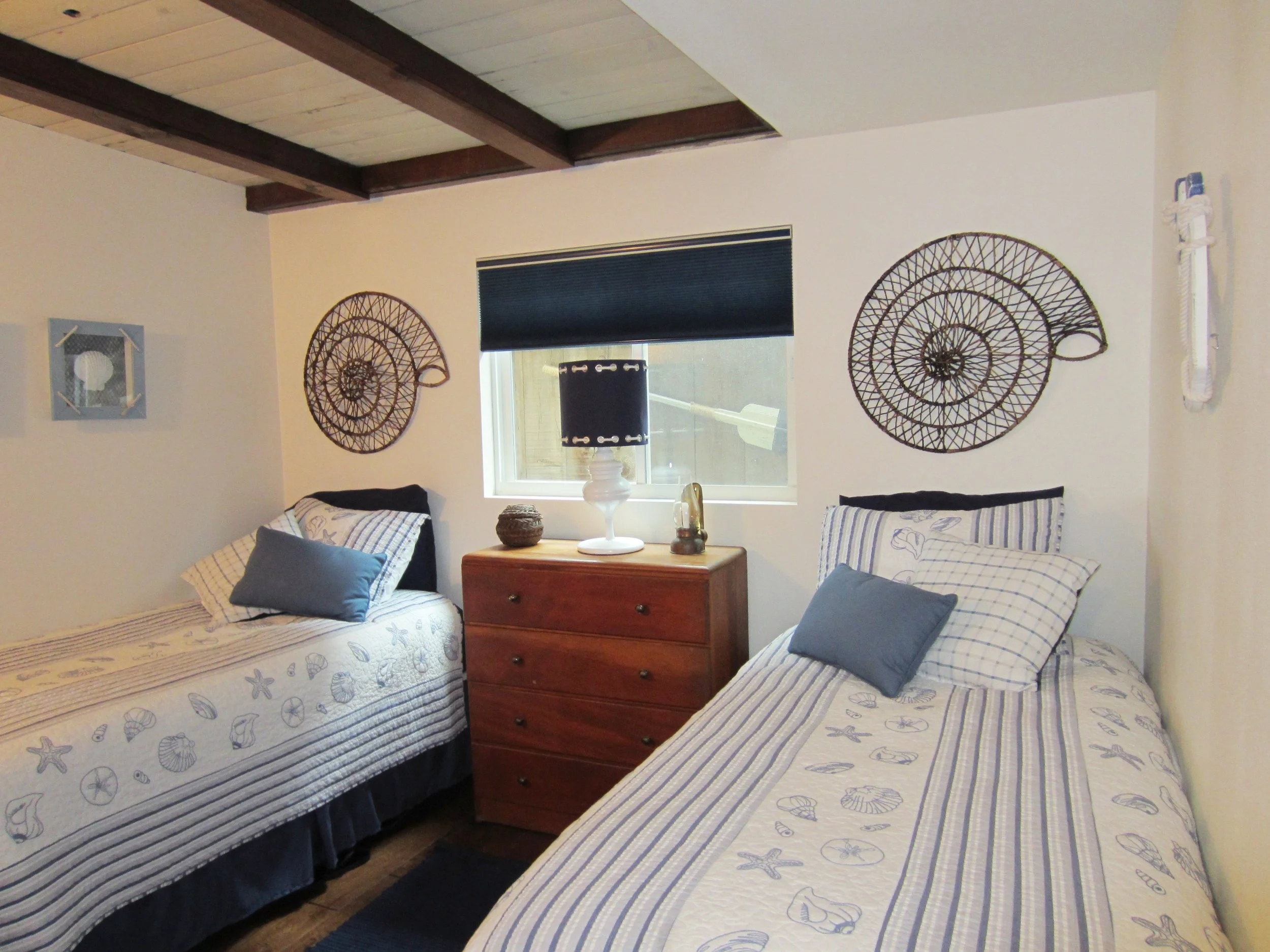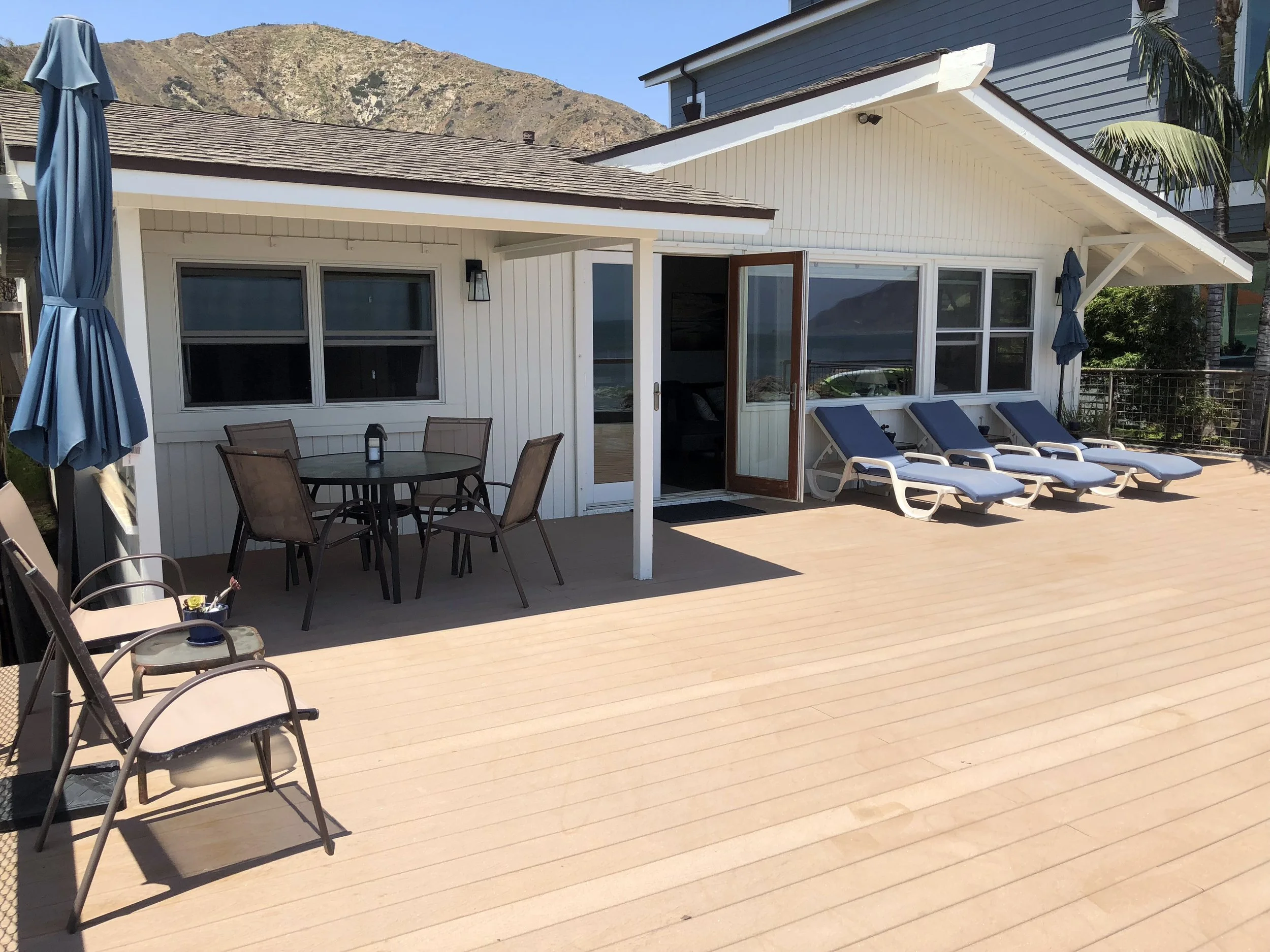 From the kitchen, living room, dining area, and expansive deck, enjoy views of the Channel Islands or catch a glimpse of a pod of dolphins cruising along the surf. The primary oceanfront bedroom is comfortable, with a queen bed and an en-suite bathroom. The second bedroom has two twins and an en-suite half bath. The "Cow-a-Bunk-a Room" is tiny yet mighty and has two sets of bunks (4 twins). It is adjacent to a bathroom with double vanities.